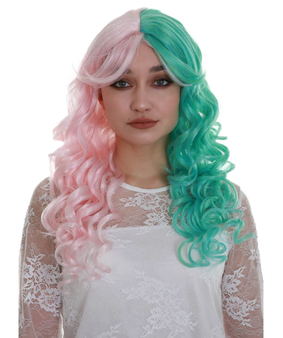 BC Women’s Two Tone Green And Pink Color Curly Medium Length Trendy Calypso Wig