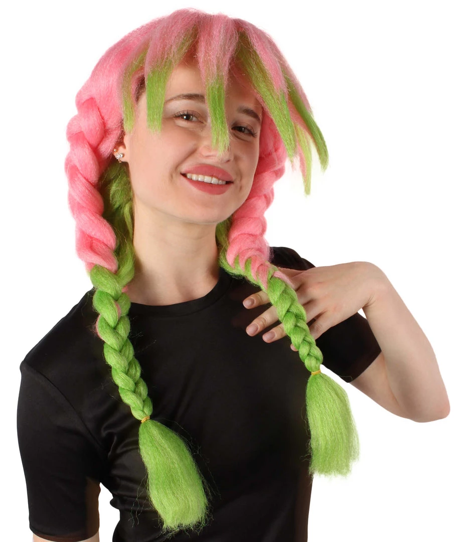 A muscular average-height demon-slaying woman, despite being extremely emotional and dubbed as “the Hashira of Love”, is reluctant to show any mercy to any demon whatsoever. Embody this kind, beautiful yet fierce character in the next Halloween, cosplay event, or any group anime party you attend. If you consider yourself a huge fan of Japanese manga and anime, our new synthetic fiber pink wig that fades into a lime green color halfway is something you can get excited about. This breathable wig also comes with two thick ponytail braids and choppy clumps voluminous bangs on the face inspired by the original character. Plus, an adjustable cap of 18-22 inches in diameter can accommodate both adults and children.