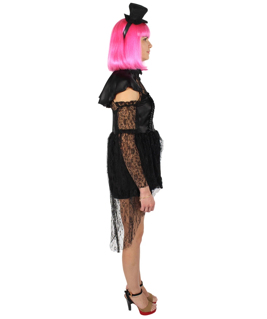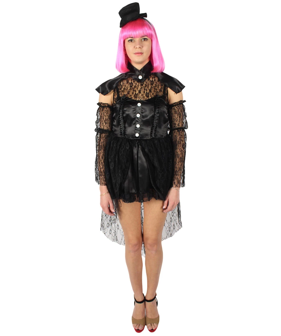 Prepare yourself to embody this poised, mysterious, and utterly composed character from a classic book series with our dreadfully elegant satin black lace costume. It’s not just a costume, but a true element of seductive and formidable beauty. With this costume, things are going to get eerie at your next costume or cosplay party! This 45-inch zip closure dress has an 8-inch cap. Ready to be dreadful in the best way?