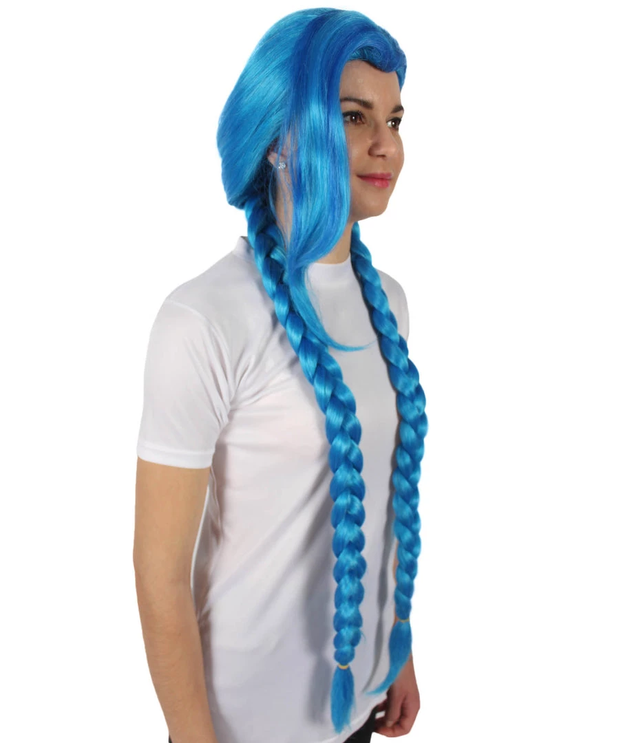 Once an innocent girl, later she turned into an impulsive criminal with a deteriorated mental state mostly due to the aftereffect of powerful serum used on her body to save her life. Superhuman strength with a capability of creating numerous contraptions and weapons in ease has made her a notorious criminal. Embody this eccentric character from a very popular online game universe that recently has created a highly acclaimed animated series with our new blue braided wig. Just like the original character from the series, this blue wig also comes with two very long braided blue ponytails and her iconic side bangs. It’s time to wreak havoc on the next Halloween, cosplay conventions, or anime group party. Plus, an adjustable cap of 18-22 inches in diameter can accommodate both adults and children.