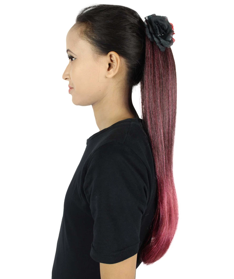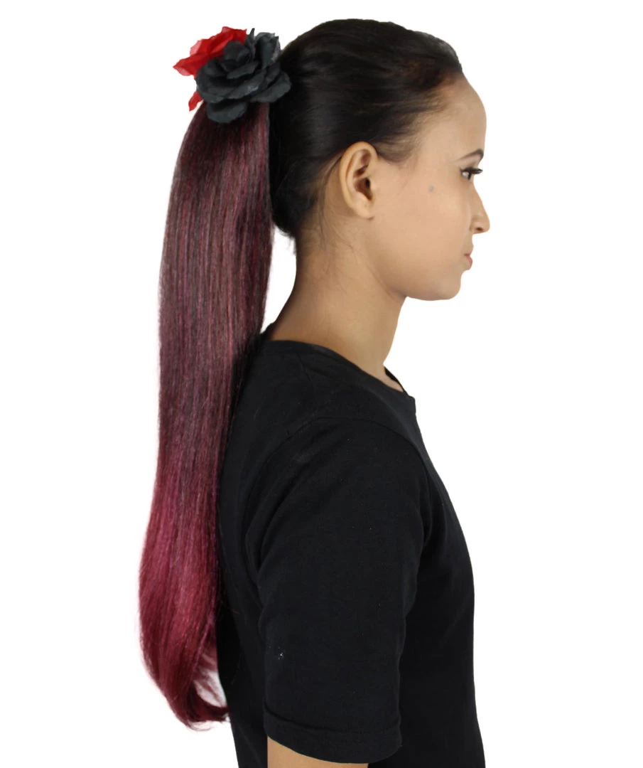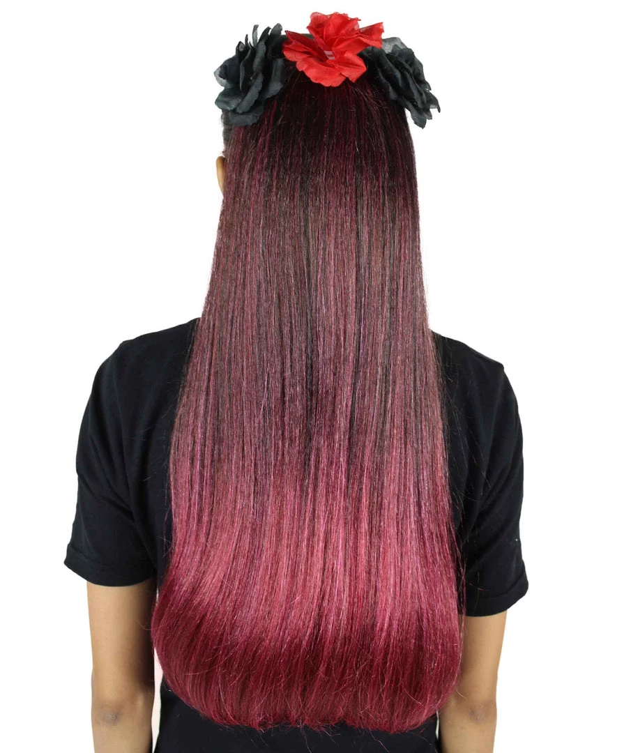 HPO Dotd Hair Clips | Women’s Long Length Day Of The Dead Hair Clips – Long Straight Black Hair – With Red Tinsel Strands And Colorful Flowers
