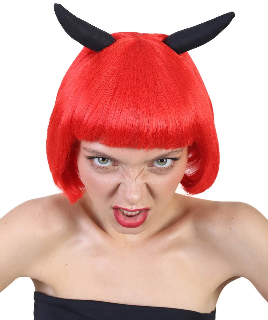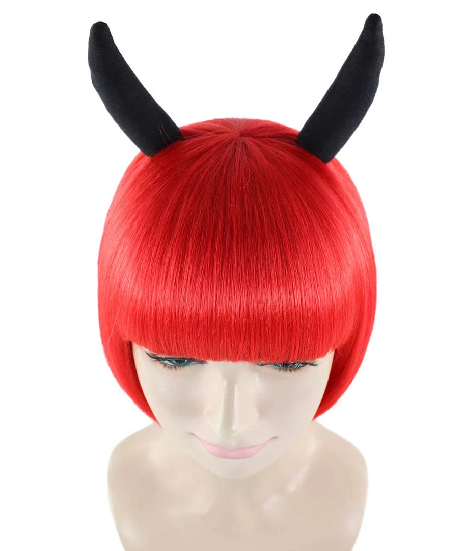 HPO Men’s Devil Womens Wig With Horns | Red Horror Character Cosplay Halloween Wig | Premium Breathable Capless Cap