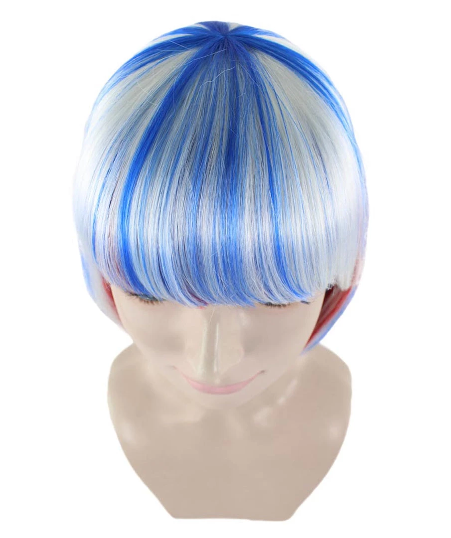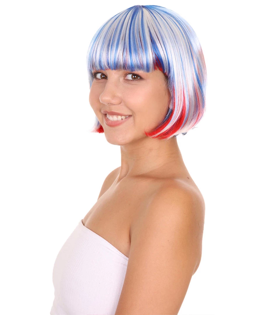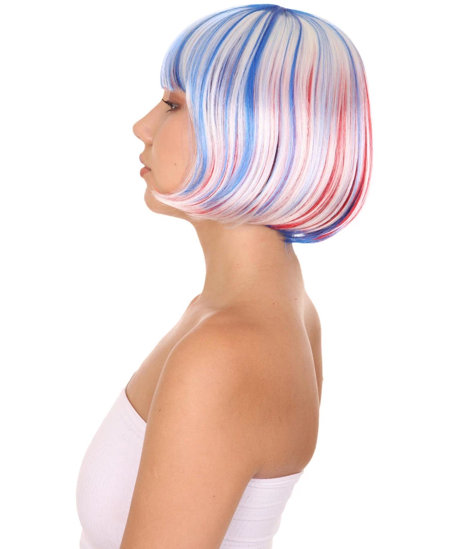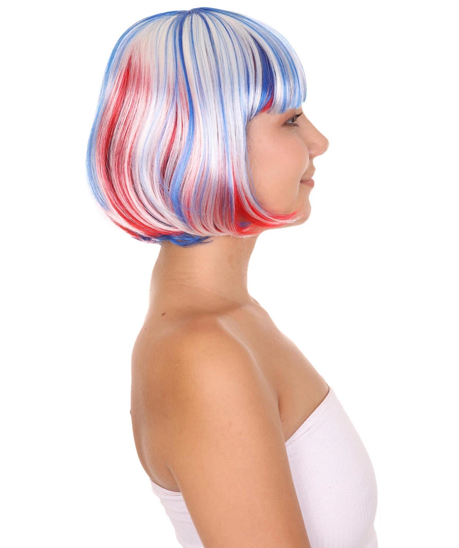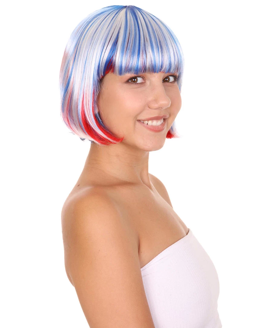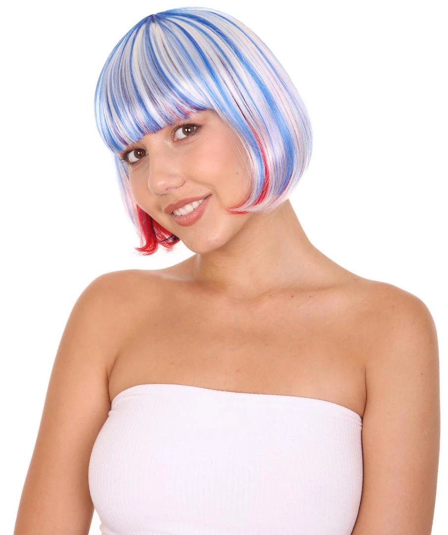 HPO Patriotic Womens Bob Wig | National Pride White Red Blue Wig | Premium Breathable Capless Cap Women’s