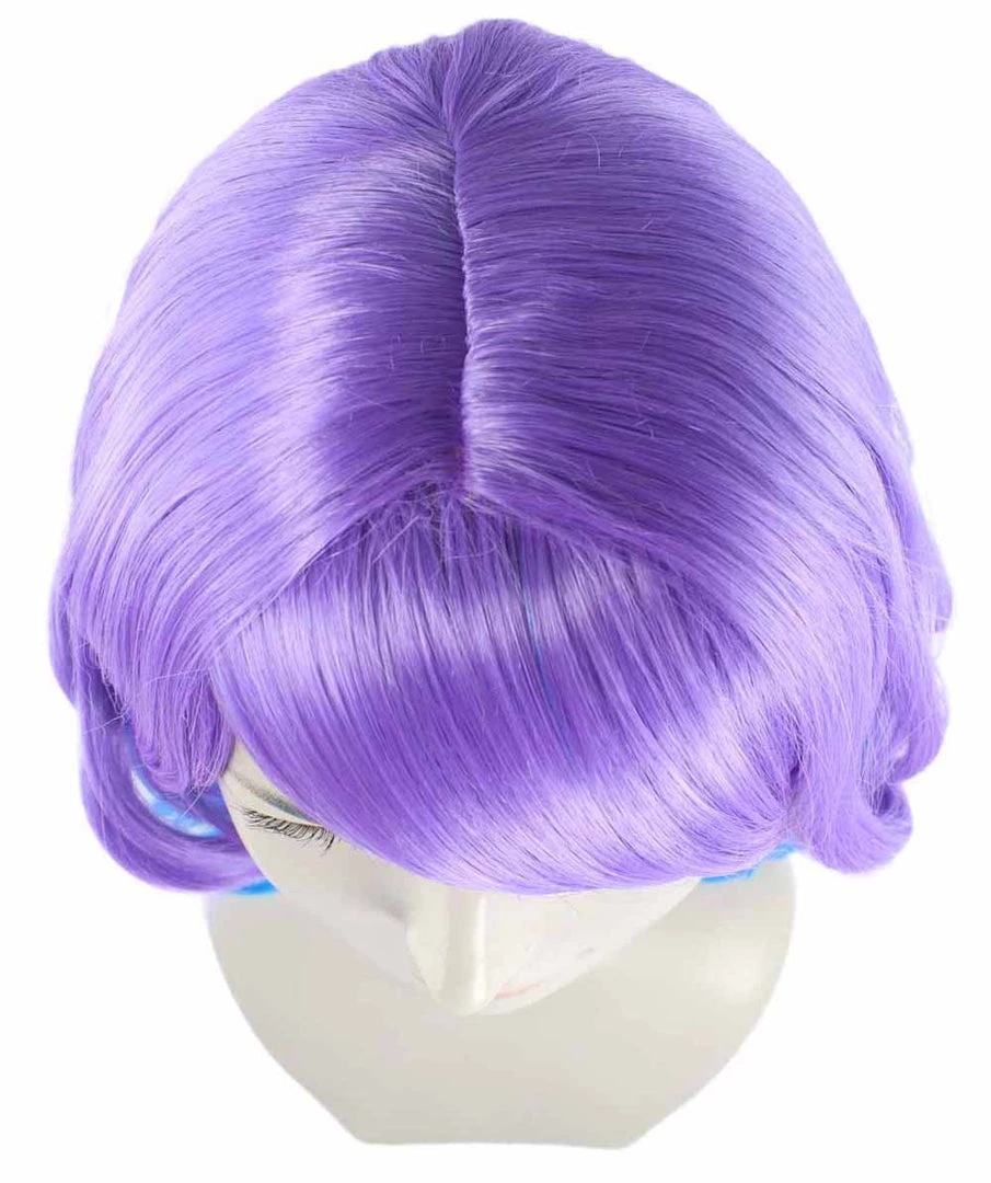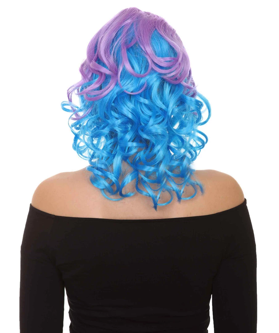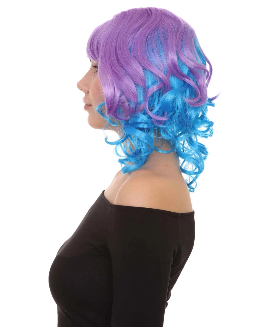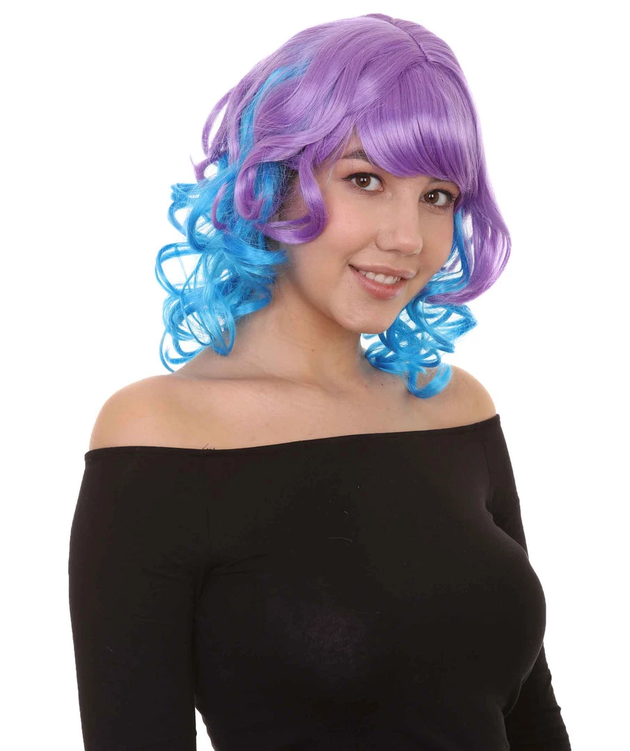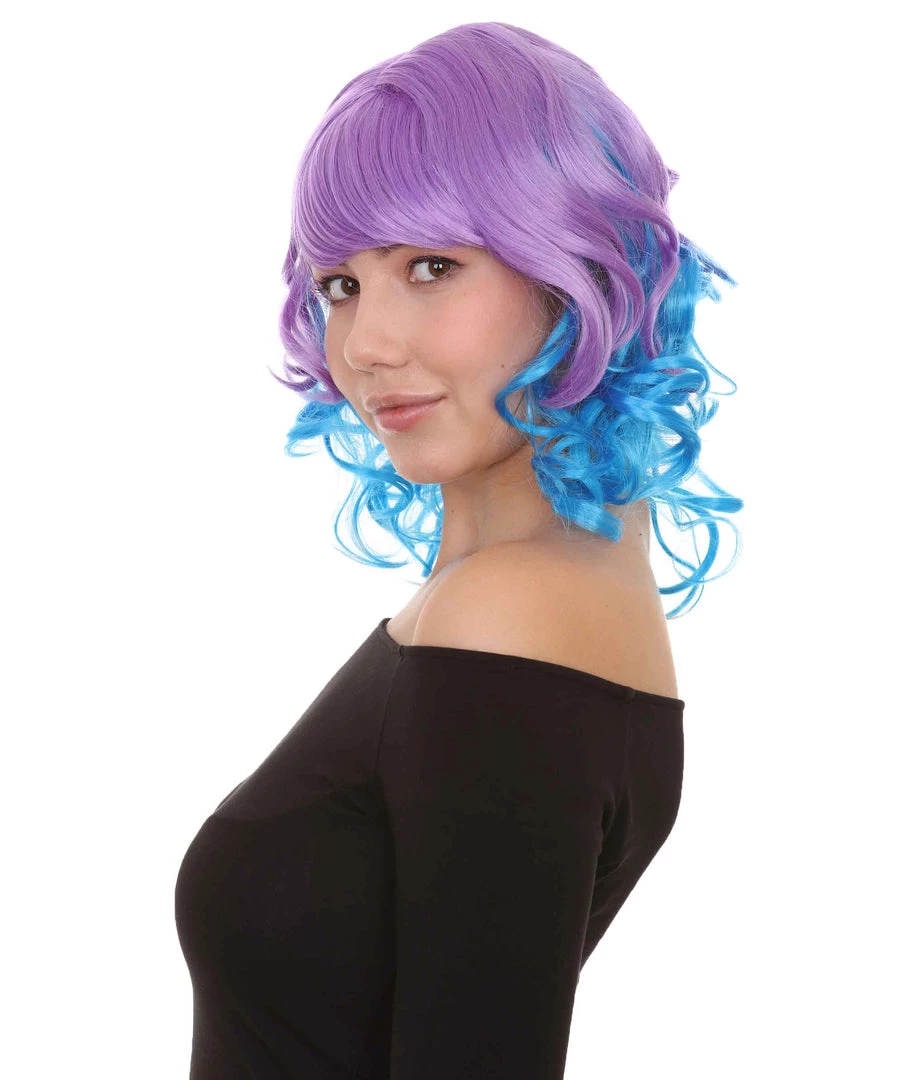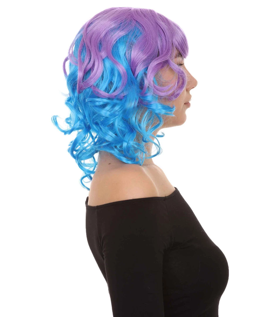 HPO Short Length Curly Party Blue & Purple Womens Wig | Stage Event Party Ready Colorful Wig | Premium Breathable Capless Cap