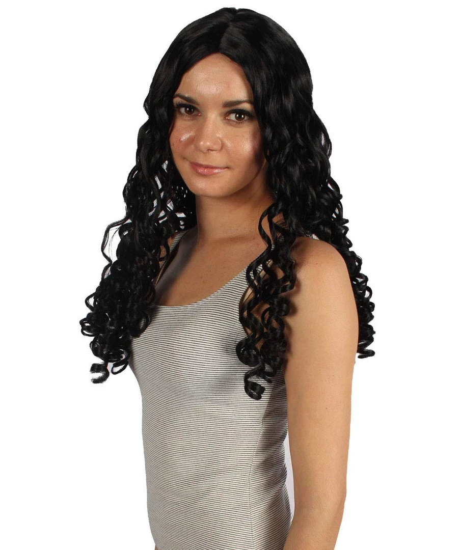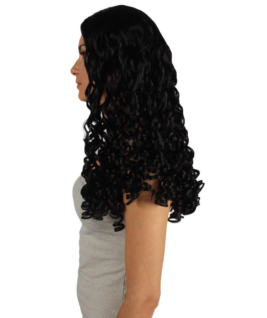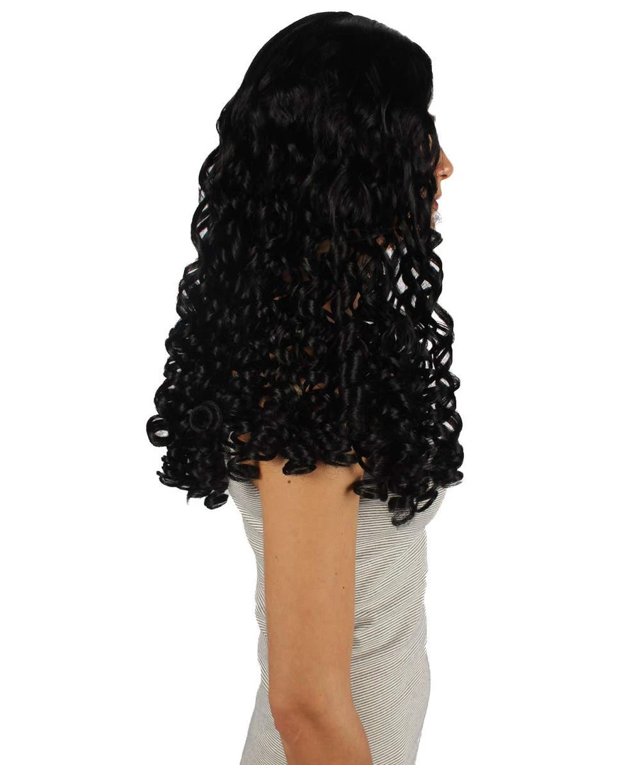 HPO Womens Colonial Ladies 18th Century Long Curly Wig | Black Historical Wigs | Premium Breathable Capless Cap