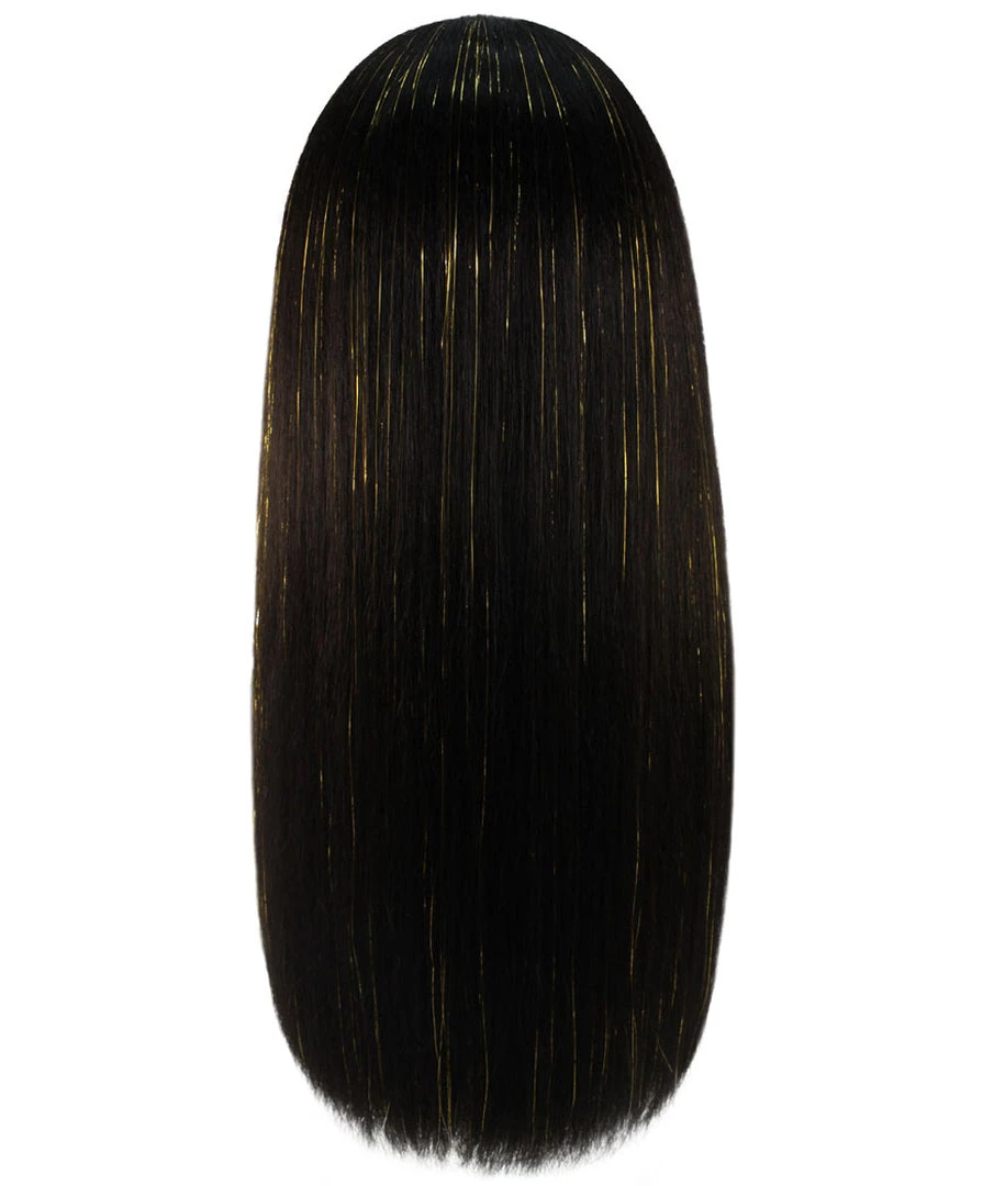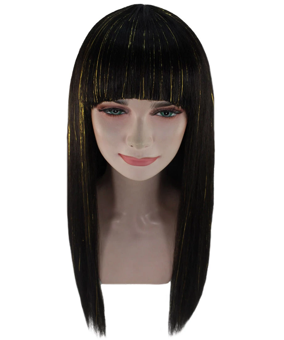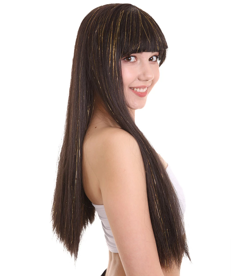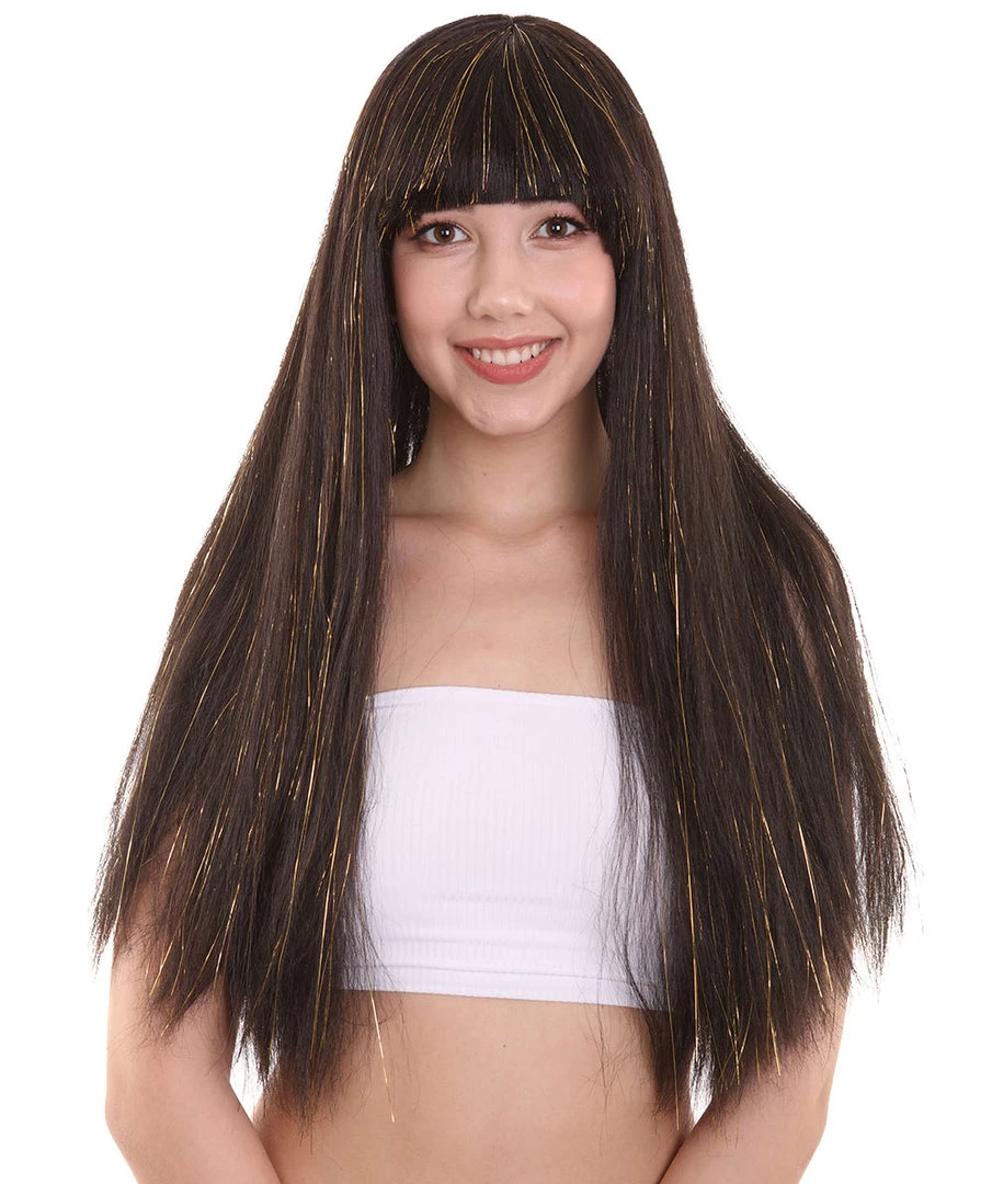 HPO Womens Egyptian Queen Long Straight Gold Tinsel Wig | Black & Gold Tinsel Historical Wigs | Premium Breathable Capless Cap