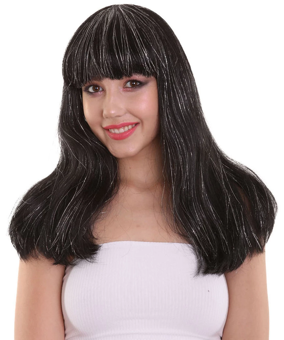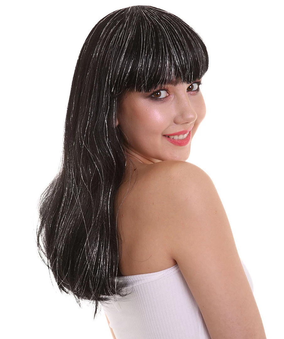 HPO Womens Long Black 90’s Bob With Silver Tinsel Highlights | Halloween Rave Wig | Premium Breathable Capless Cap