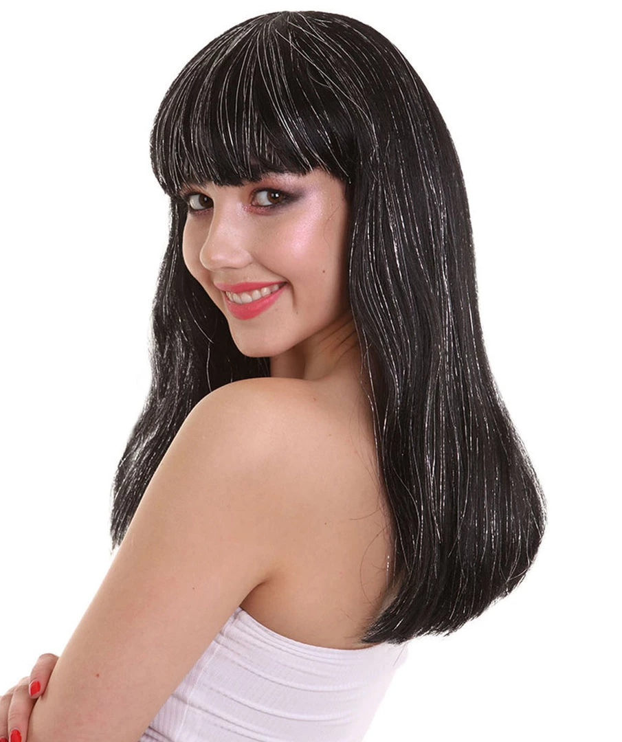 Be the first to review “HPO Womens Long Black 90’s Bob With Silver Tinsel Highlights | Halloween Rave Wig | Premium Breathable Capless Cap” Cancel reply