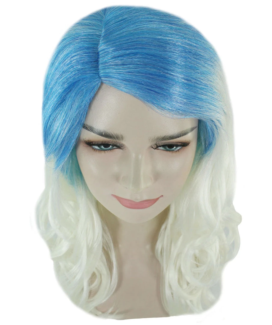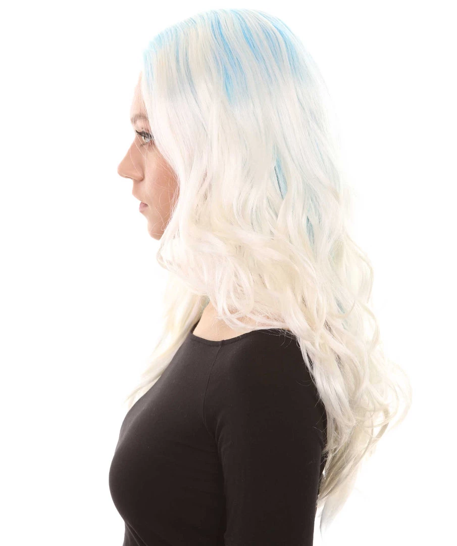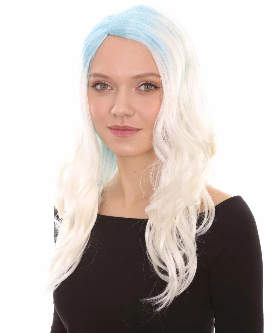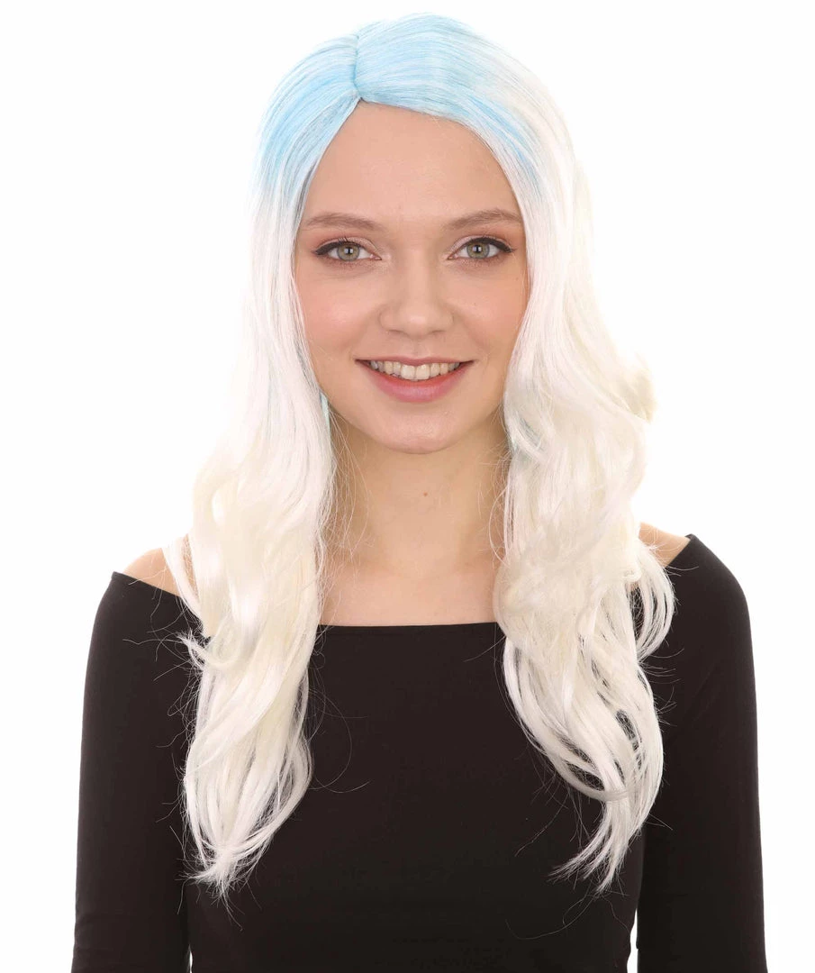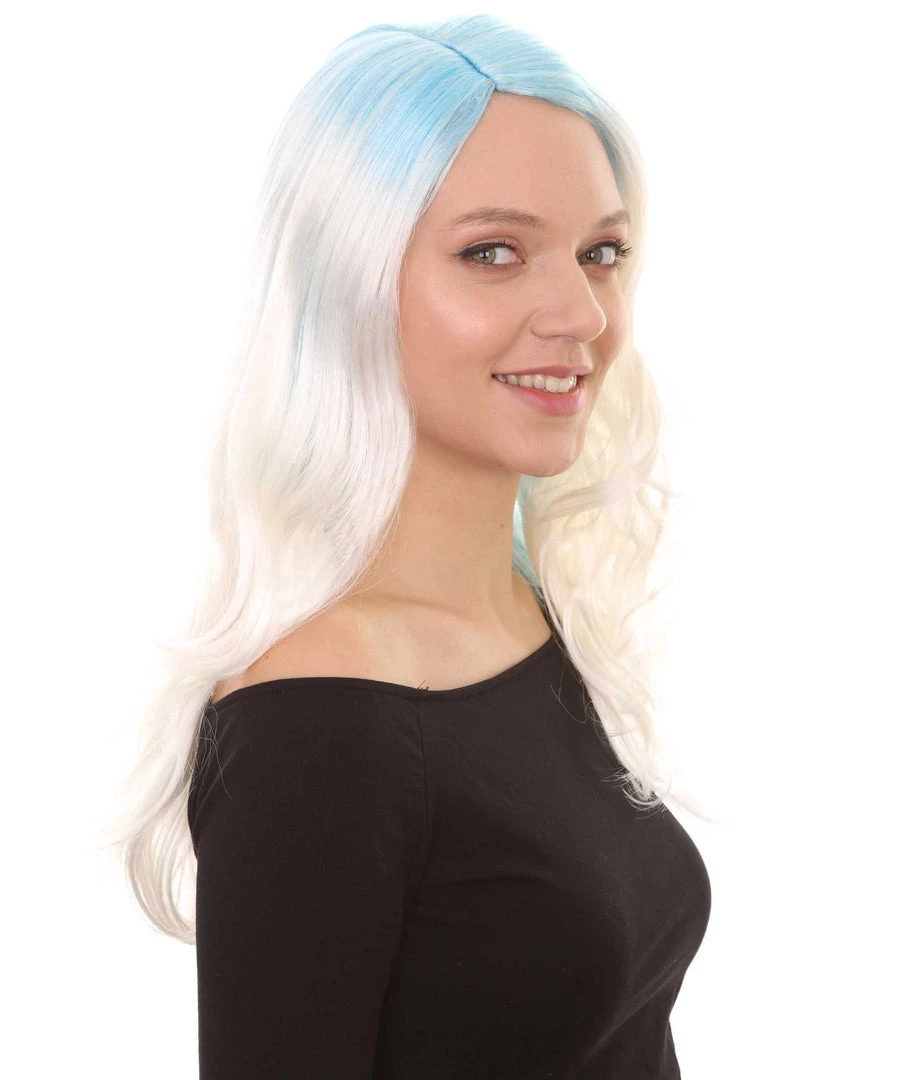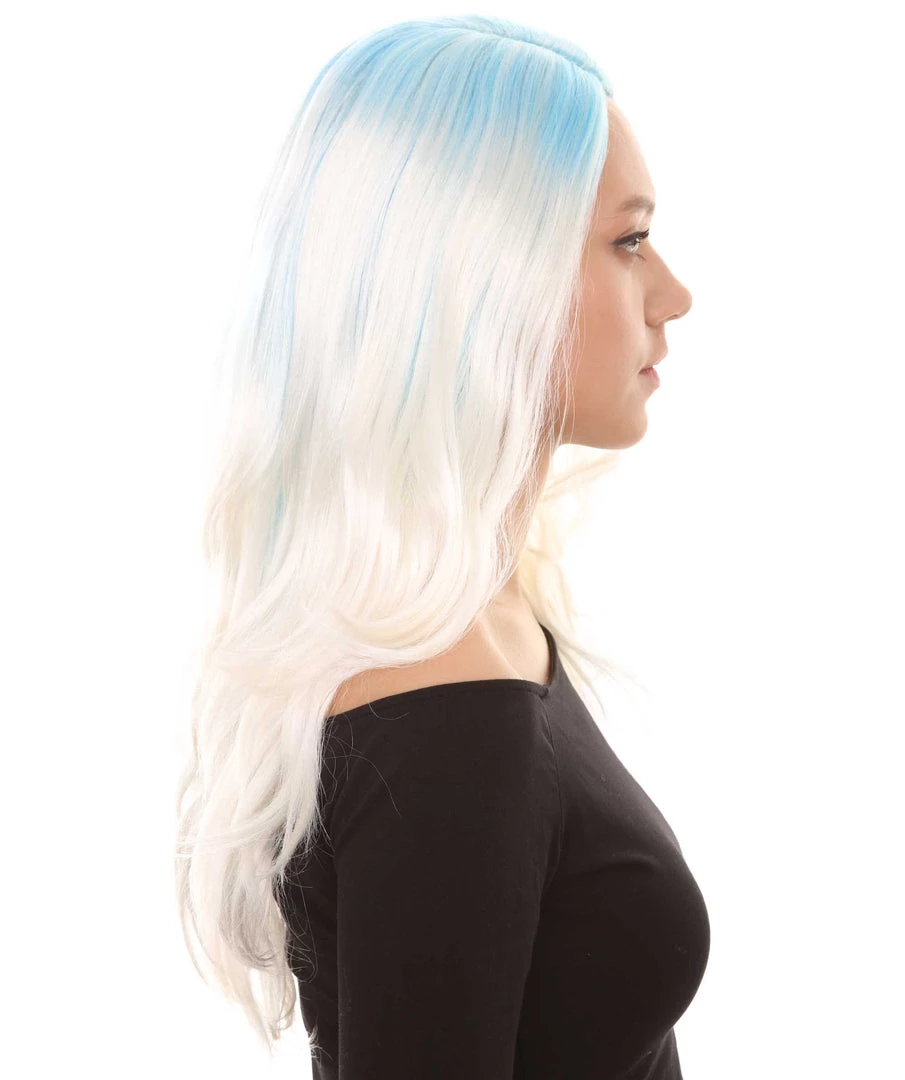HPO Womens Long Wavy Two-tone Wig | Blue & White Colorful Wigs | Premium Breathable Capless Cap