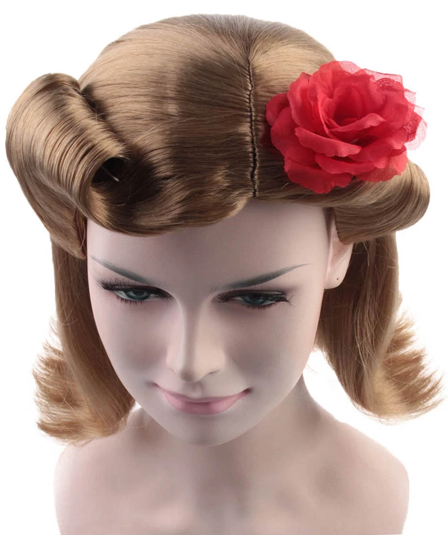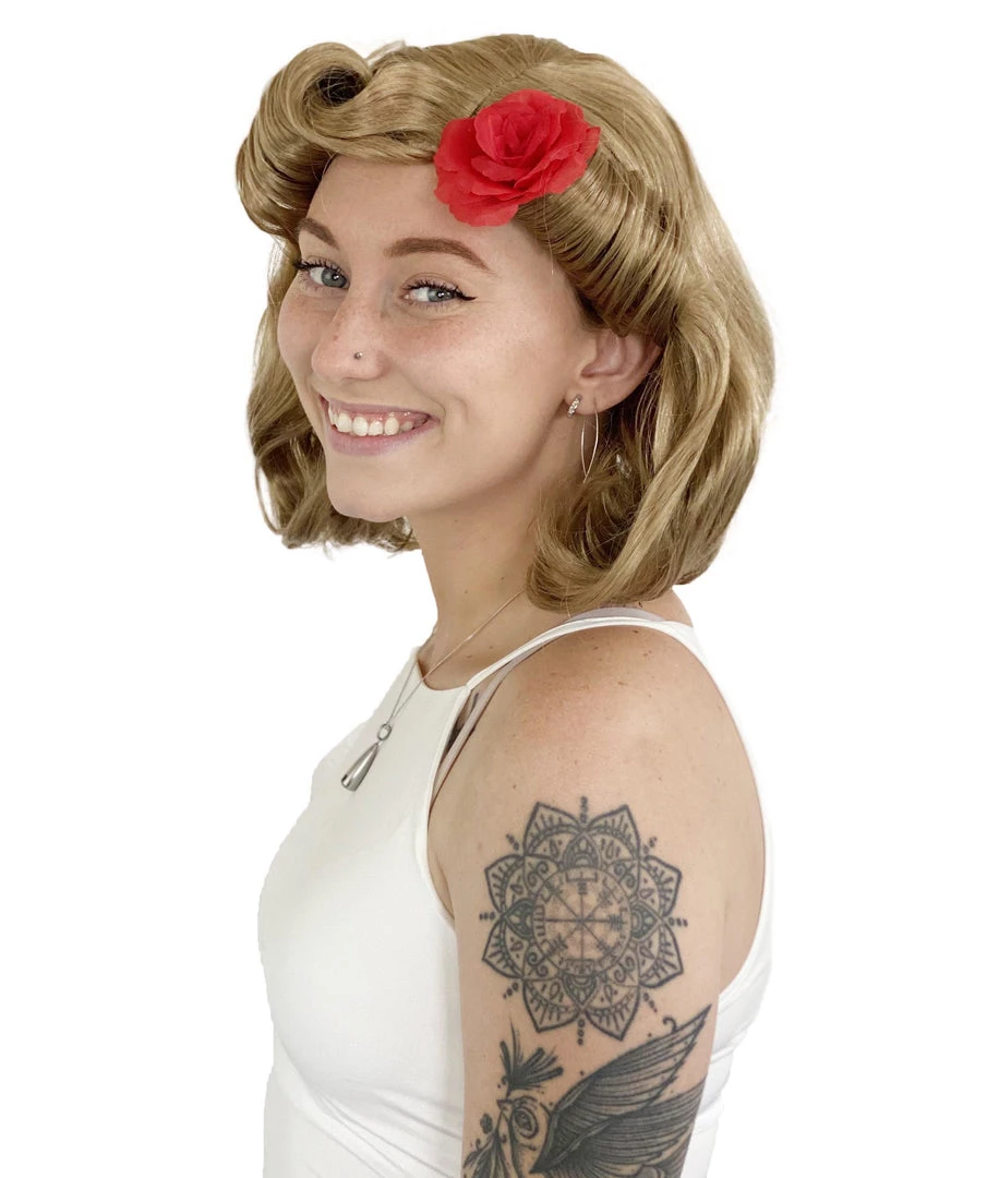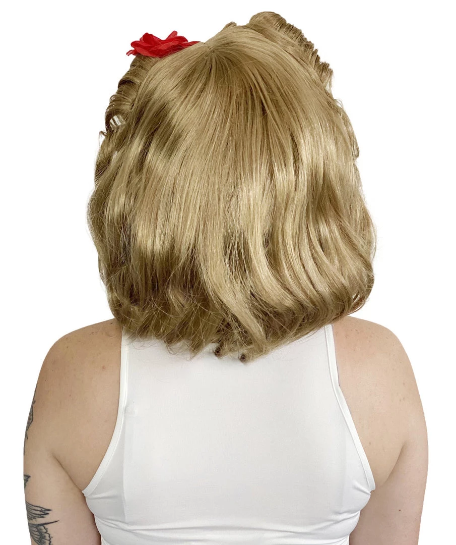 HPO Womens Pin Up Wig With Rose | Party Ready Fancy Blonde Cosplay Halloween Wig | Premium Breathable Capless Cap